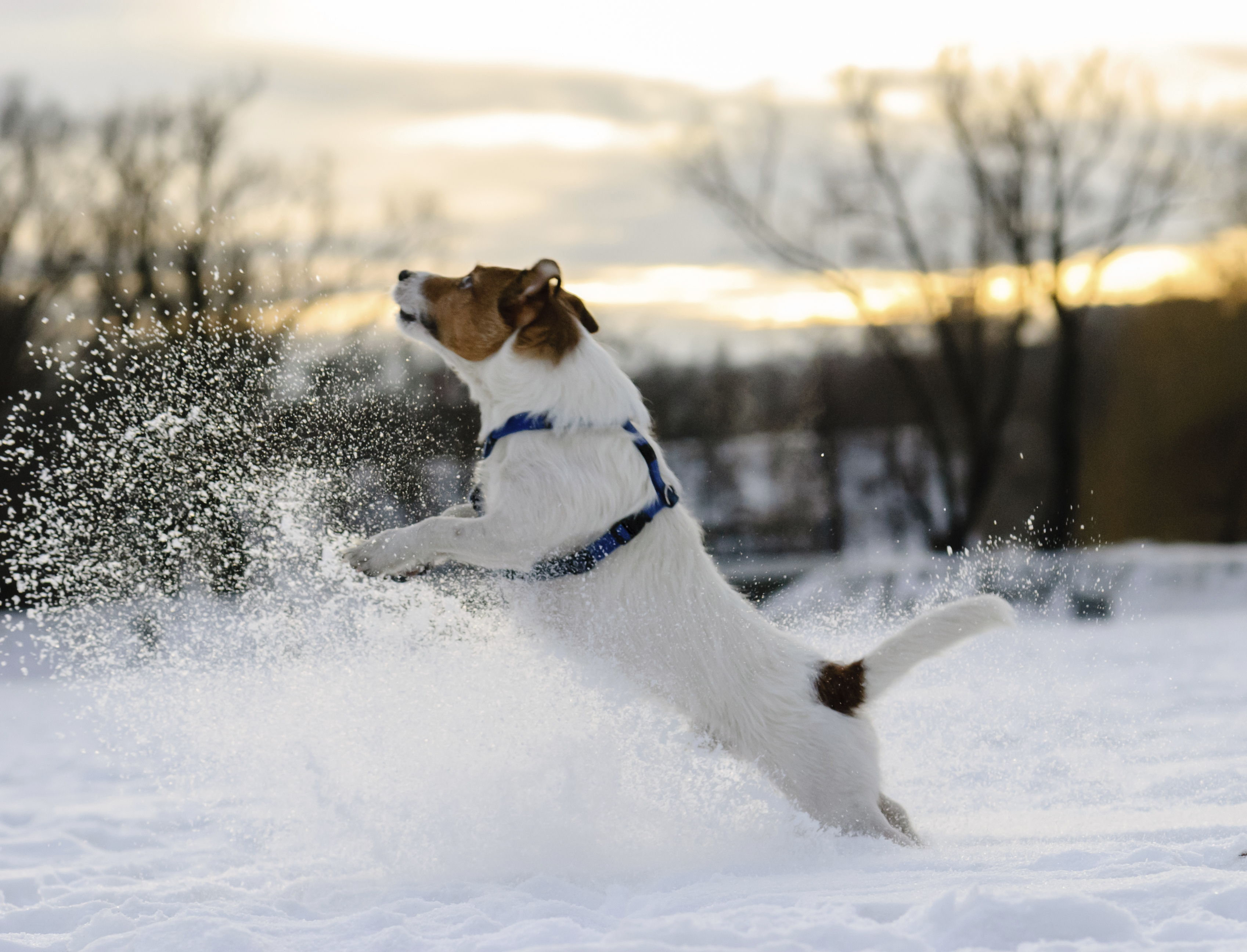 dog making splashes of snow. Jack Russell Terrier playing on sun